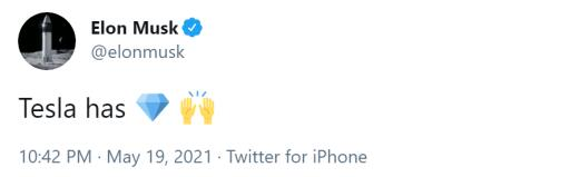 同日,在市场暴跌之际,特斯拉CEO马斯克在个人社交媒体账号上发布了“特斯拉有钻石手(Diamond Hand)”的消息。按通常的意思,有“钻石手”的意思是不畏市场波动,持有仓位直到目标。市场观点将其解读为特斯拉不会抛售手中已有的比特币。这条消息也让比特币的24小时跌幅从之前的超过30%收窄到大约14%,价格重返4万美元。