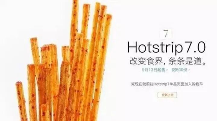 同年9月7日,卫龙又“碰瓷”了iPhone。就在iPhone 7发售的前一天,卫龙食品将天猫旗舰店的风格改成了妥妥的苹果风,誓做辣条界的“苹果”,并且推出了Hotstrip 7.0(辣条7),配文 “ 改变食界,条条是道” 。 这一营销案例,至今仍在美食文案界占据第一名的宝座。