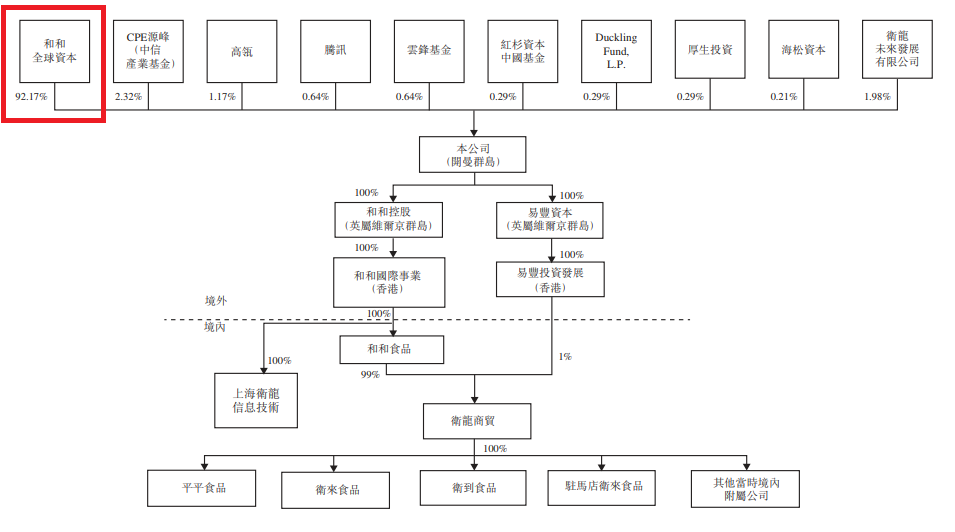 招股书披露的数据显示, 在上市前,卫龙美味的股权结构中,和和全球资本的股权比例为92.17%。而和和资本是由兄弟两人通过信托计划共同持有的一家投资公司。