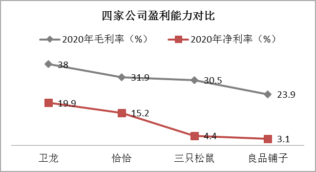 根据招股书及各家公司年报披露的数据, 2020年卫龙的毛利率为38%,净利率为19.9%;与之形成对比的三家公司 中,恰恰的毛利率为31.9%,净利率15.2%,良品铺子的毛利率为30.5%,净利率仅为4.4%,而收入规模最大的三只松鼠毛利率仅有23.9%,净利率更是低至3.1%。