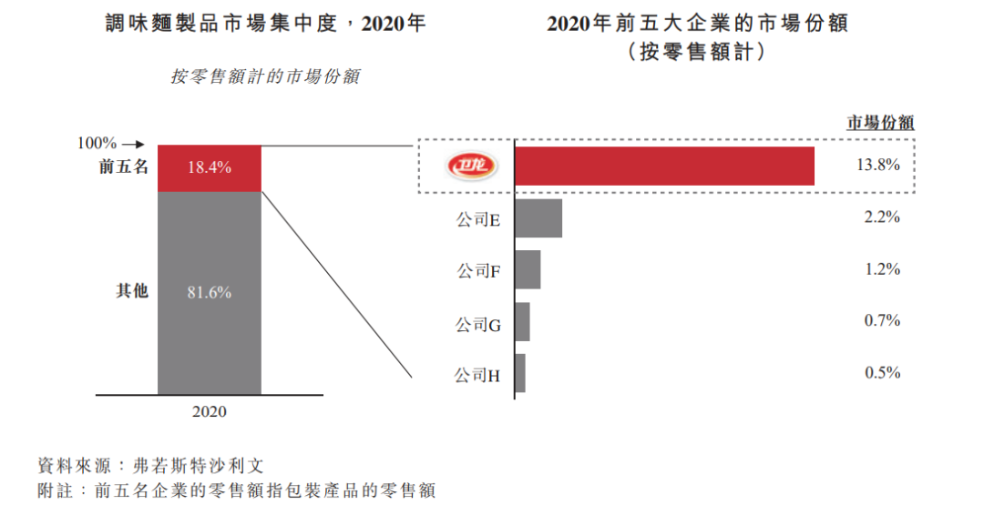 具体来看,在调味面制品(传统辣条)赛道,市场前五大公司的合计占有率为18.4%,其中卫龙的市占率稳居第一达到13.8%,不仅超过2-5名公司的市占率之和,且为第二名公司市场份额的6.3倍。