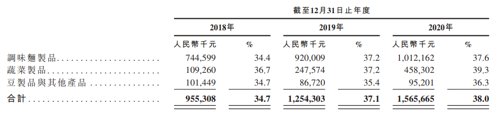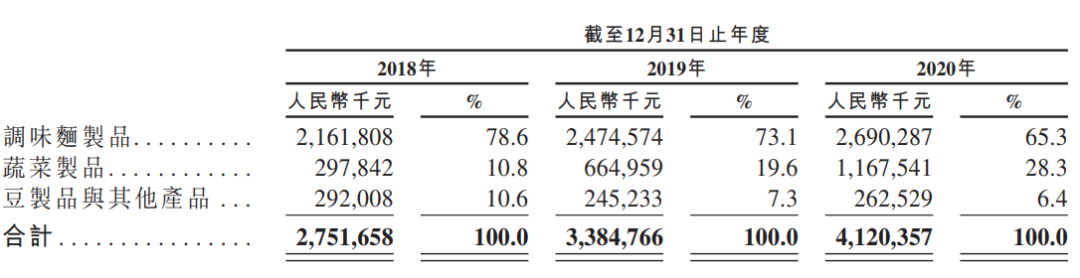 招股书显示,目前, 卫龙的产品分为三大类,分别为调味面制品、蔬菜制品、豆制品及其他。