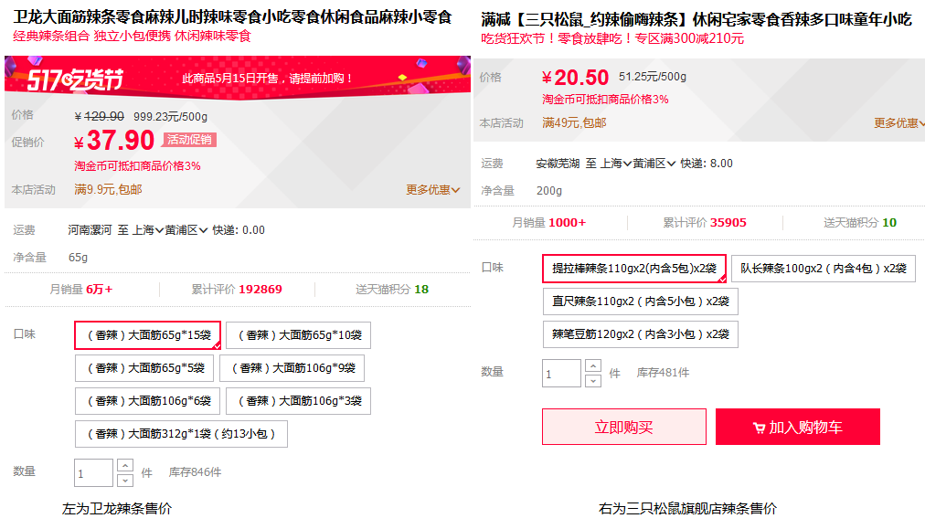 从售价角度看,以5月14日天猫旗舰店卫龙与三只松鼠的价格为例。