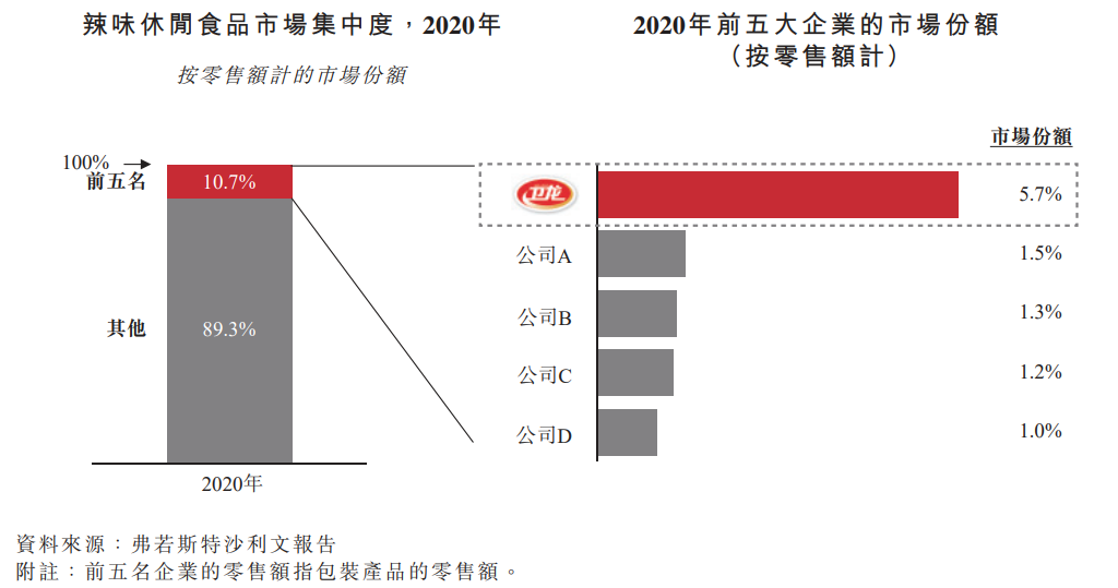 根据招股书数据, 中国辣味休闲食品的市场格局较为分散 。2020年,前五大公司的合计市占率为10.7%,但其中卫龙的市占率为5.7%,超过2-5名公司的市场份额之和。