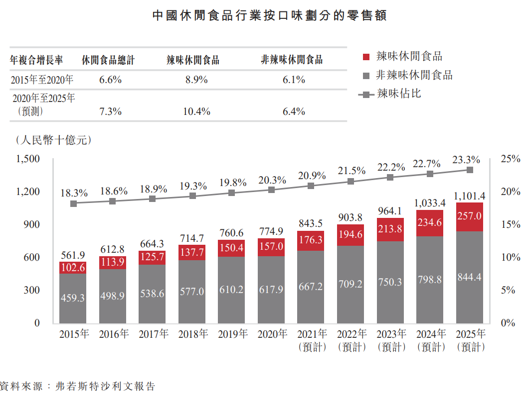 根据弗若斯特沙利文报告,中国休闲 食品行业 的市场规模在2020年已经达到774亿元, 过去5年的复合增速为6.6%。 而其中, 辣味休闲食品的增速远高于非辣味休闲食品,达到8.9% 。该机构报告预计,未来5年,辣味休闲食品赛道的复合增速将超过10%。