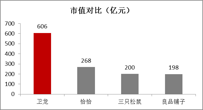 5月13日,卫龙向港交所递交了招股书,根据已披露数据计算,卫龙目前估值约为606亿元,它的市值是三只松鼠市值的3倍,并接近在A股已经率先上市的三家公司——恰恰食品、良品铺子及三只松鼠的市值总和,以5月14日收盘价计算,后三家公司的合计市值也仅有666亿元。