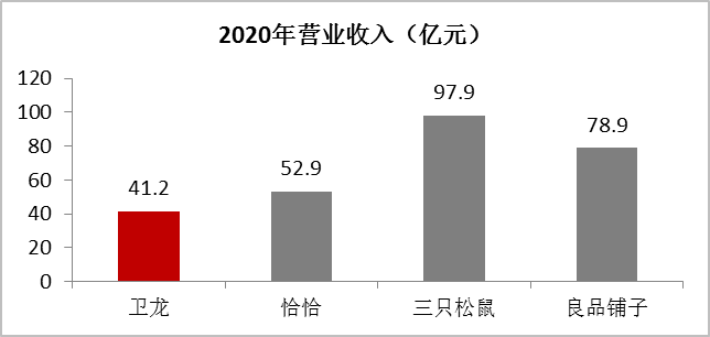 前文提及的三家A股上市公司,根据公司年报数据,恰恰食品2020年的营业收入为52.9亿元,良品铺子2020年的营业收入为79亿元,三只松鼠2020 年的营业收入更是高达 98亿元。在 收入层面,刚破40亿元大关的卫龙很难撑起接近三家企业估值之和的水平。