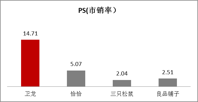 按照目前606亿元的市值计算,卫龙的PS约为14.7倍,远远高于竞争对手。恰恰的市销率为5.07倍,三只松鼠2.04倍,良品铺子2.51倍 。