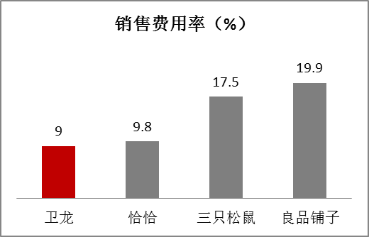 而在销售费用方面,由于卫龙长期以来线上营销出的口碑护佑,公司不需要花费巨额费用在线下营销上。同时,公司采用经销商模式分担销售压力,因此,近三年,卫龙的分销及销售费率仅为8.5%、8.3%、9.0%。与此形成对比的是,2020年,恰恰的销售费用率为9.76%,三只松鼠的销售费用率为17.48%,良品铺子的销售费用率为19.89%。 三只松鼠及良品铺子的销售费用率均达到卫龙的2倍或以上。