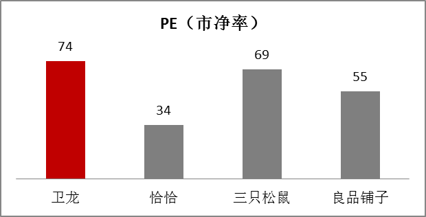 按照2020年的净利润测算, 机构给予卫龙的PE估值约为74倍 , 而恰恰食品的PE为34倍,良品铺子69倍,三只松鼠55倍 。从PE水平来看,卫龙仍然远高于竞争对手,仅三只松鼠的PE与卫龙较为接近。