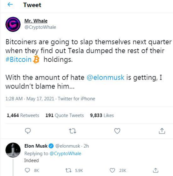 当地时间周一凌晨,一位名为“cryptowhale”的网友在社交媒体上表示:“ 下个季度,当比特币投资者发现特斯拉抛售了他们剩余的持仓时,他们会扇自己耳光的。 @elonmusk已经受到这么多的仇恨,我不会怪他……”