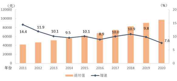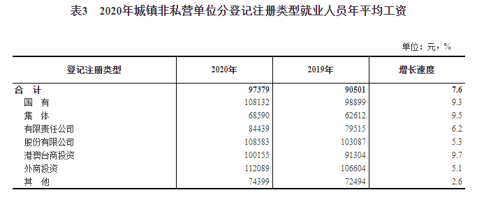 全国城镇非私营单位就业人员年平均工资97379元,比上年增加6878元,名义增长7.6%,增速比2019年回落2.2个百分点。扣除价格因素,2020年全国城镇非私营单位就业人员年平均工资实际增长5.2%。
