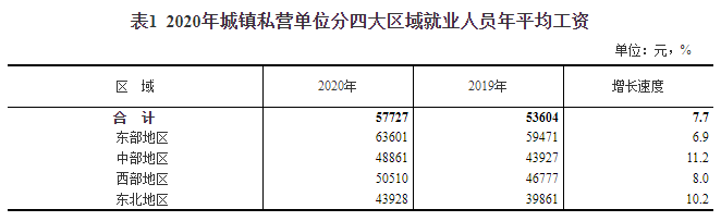 城镇私营单位就业人员年平均工资由高到低依次是东部、西部、中部和东北地区,分别为63601元、50510元、48861元和43928元,比上年分别增长6.9%、8.0%、11.2%和10.2%。
