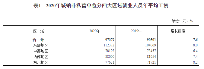 2020,全国城镇非私营单位年平均工资近10万元,东部地区年平均工资超10万元。