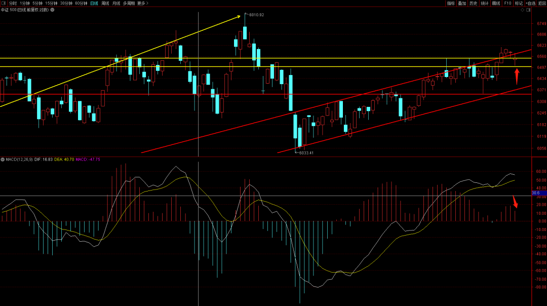中证500出现弱势结构,短期可能会跌破6500点附近的支撑,且目前日线再次出现顶分型结构,后续需要注意把控节奏谨慎追高。