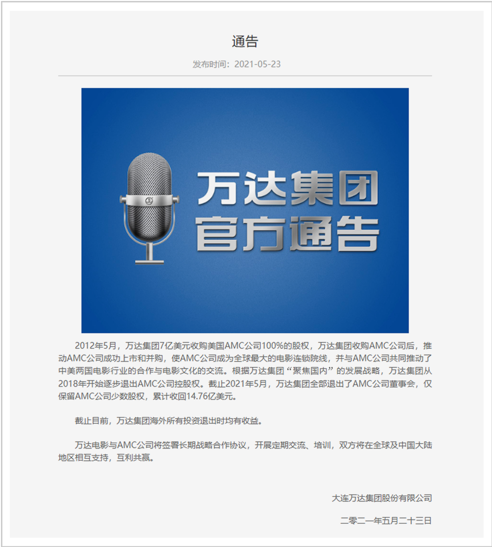 5月23日早间,大连万达集团在其官网发布消息,公司已全部退出了AMC Entertainment Holdings Inc.(NYSE:AMC)董事会,仅保留少数股权,累计回笼资金14.76亿美元。