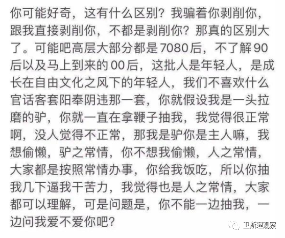 70后和80后那两代,都还是比较老实的,虽然知道公司讲的很多精神,是在给洗脑,但是也不会站出来公开反驳。
