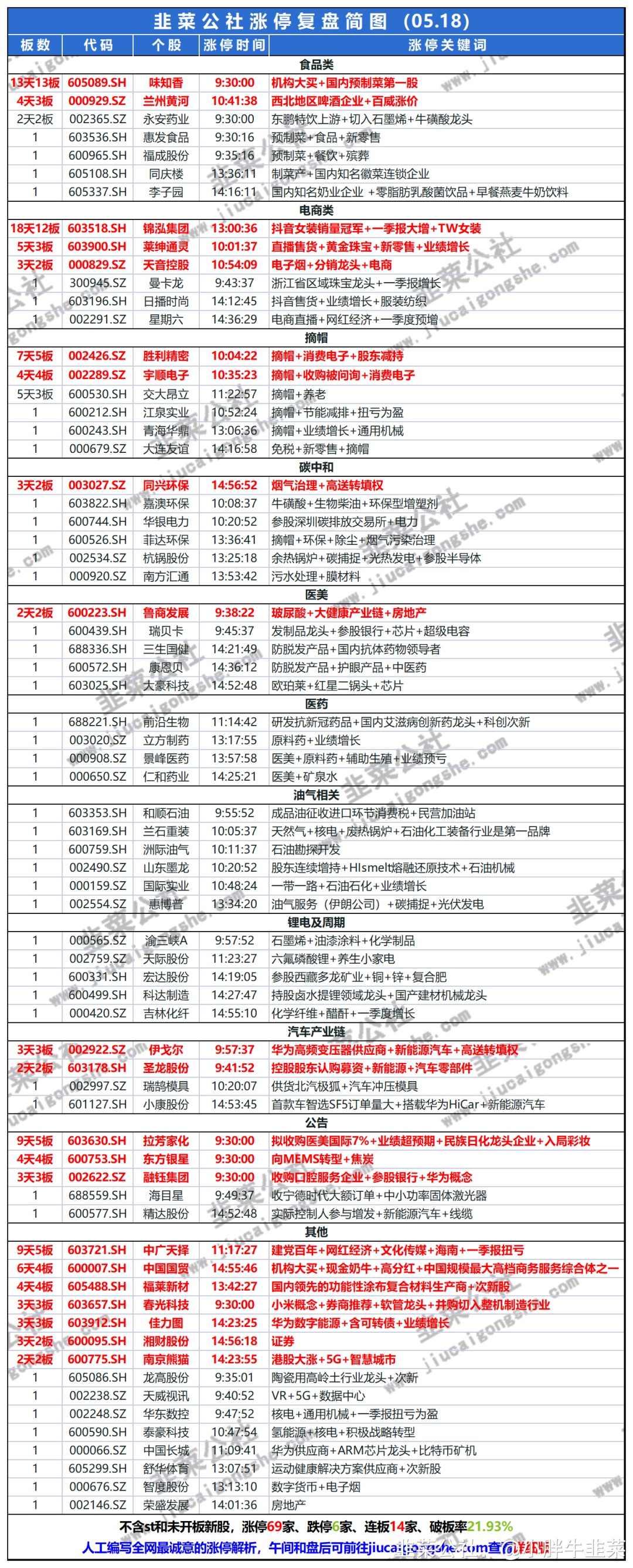 量化数据: 收盘连板 19 只(含ST股5只), 14 只非ST连板— 正常 ,其中 0 只创业板20%连板—正常,连板炸板(2-3板为主)2只—极少,涨停炸板率 22% —较低 ,涨停连板率 50.00% —极高 ,连板晋级率 64.71% —极高 。