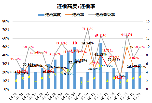 量化数据: 收盘连板 21 只(含ST股7只), 14 只非ST连板— 正常 ,其中 1 只创业板20%连板—正常,连板炸板(2-3板为主)6只—正常,涨停炸板率 35% —正常 ,涨停连板率 26.58% —正常 ,连板晋级率 50.00% —较好 。