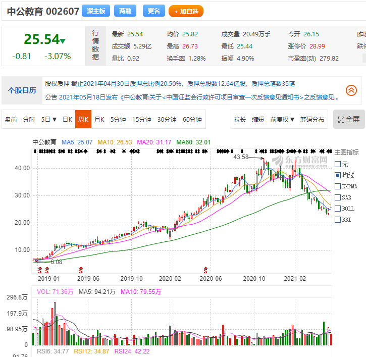 中公教育股价在2020年11月达到43.58元/股的高点之后,就随着抱团股的松动,逐渐盘整震荡、下滑到如今的25.54元左右。