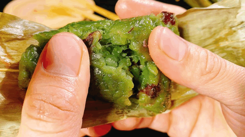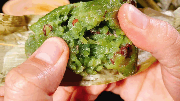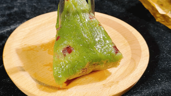 绿色蜜豆粽 ,红豆镶嵌其中,颗粒分明、糅绵甜香,玲珑骰子安红豆,此物最宜寄相思。