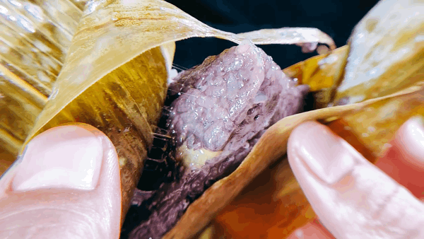 黑色菠萝粽 ,黑色糯米和淡黄甘甜的菠萝,浓亮的黑配上隐隐约约的黄,一口咬进去,爱菠萝的人会被清爽的口感瞬间抓住。