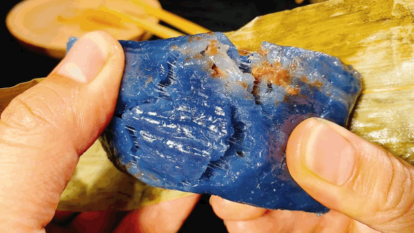蓝色普洱茶蜂蜜粽 ,是普洱与蜂蜜邂逅的产物,普洱茶浓厚,蜂蜜性凉,配上清冷的蓝色糯米,咬进嘴里,满口生津,回味悠长。
