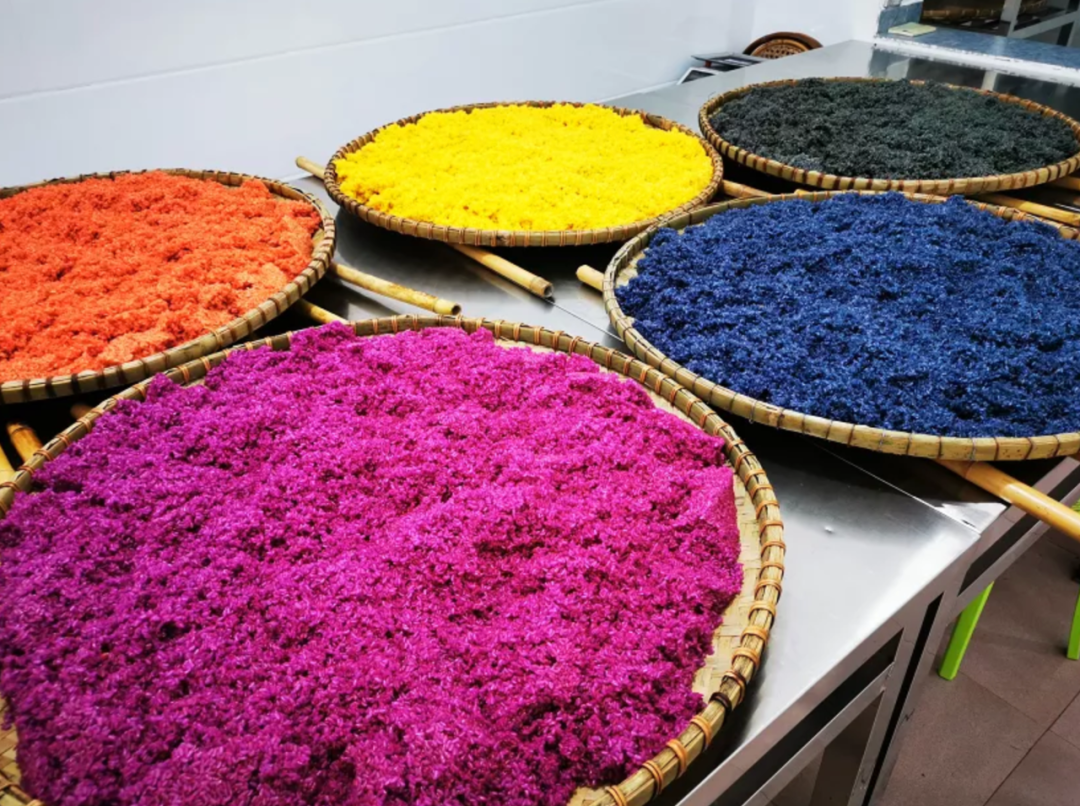 经过漂洗、浸泡、上色、蒸制、烘干等一套标准的生产工艺流程,才能得到这五颜六色的花糯米。