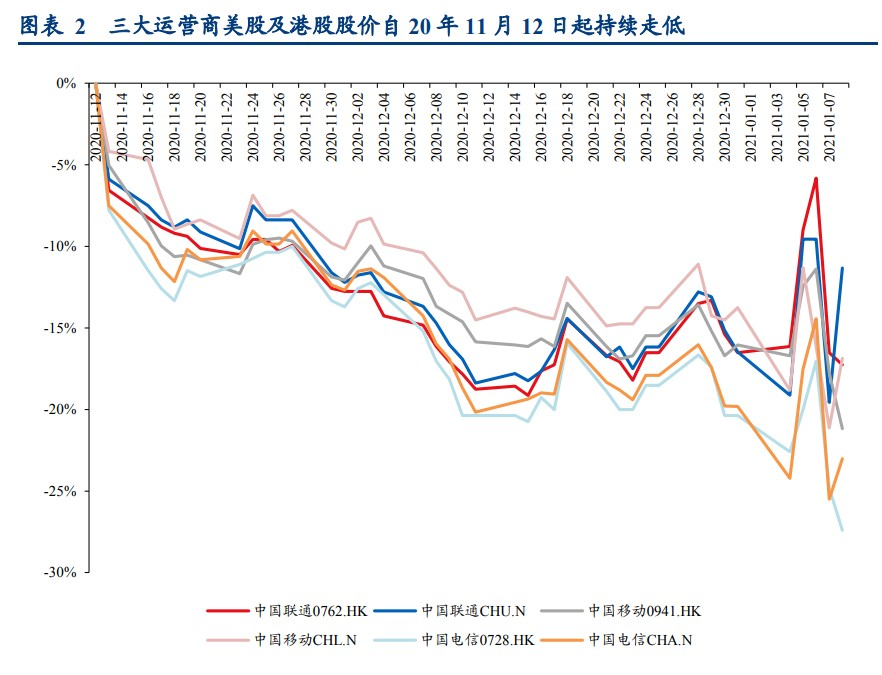 2020年11月12日,美国总统特朗普签署行政令,禁止美国人士交易美国国防部定义下的所谓中国涉军企业的证券,其中包括中国电信、中国联通、中国移动等共计30余家中国企业。自11月12日事件以来,三大运营商基本面并未发生较大变化,但港股及美股ADR价格持续走低。