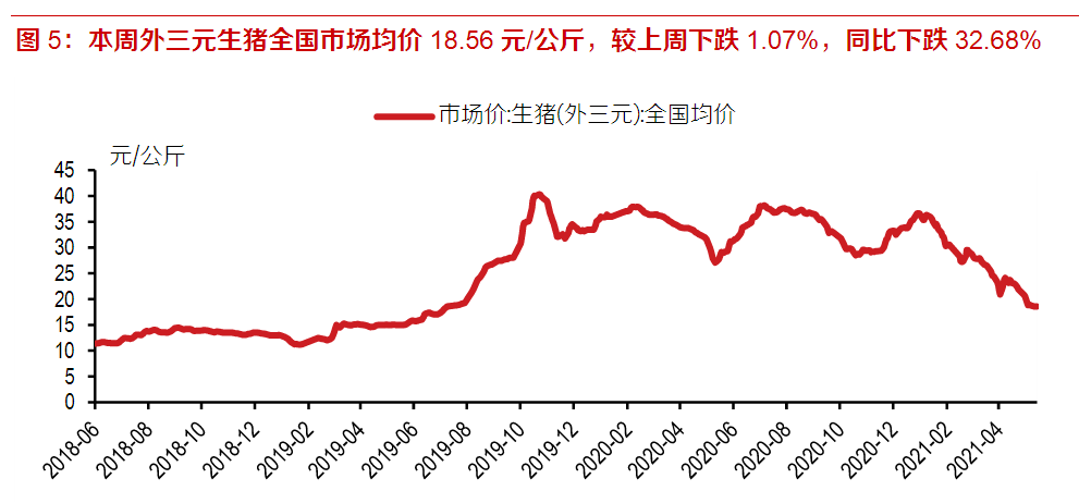 事实上,2021年以来,生猪价格已持续下行近5个月。据了解,上周五外三元生猪全国市场均价18.56元/公斤,较上周下跌1.07%,同比去年下跌32.68%,已跌至2019年7、8月份水平。