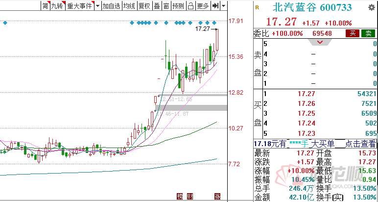 5月17日,汽车整车板块再次强势领涨,华为概念股北汽蓝谷(600733)涨停,这是近四个交易日第二个涨停,北汽蓝谷近4日累计涨幅达19.85%。