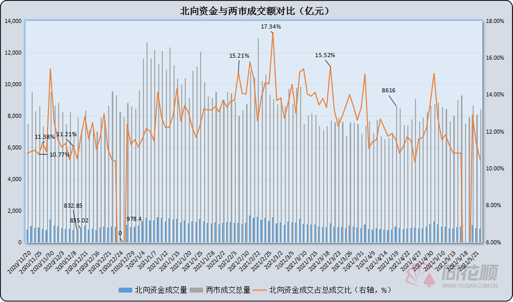 成交量方面,两市合计成交金额8423亿元。北向资金成交额为883.52亿元,占比A股总成交量的比重为10.49%。