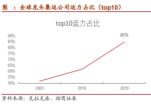 集装箱航运市场具有网络性和规模效应,近20 年来集中度逐步提升。过去 5 年,集运市场较为低迷,行业并购整合频发,行业内TOP10 运力占比提升至 85%。在主要干线上,三大联盟(2M,OCEAN Alliance,The Alliance)占比已经达到 90%以上。