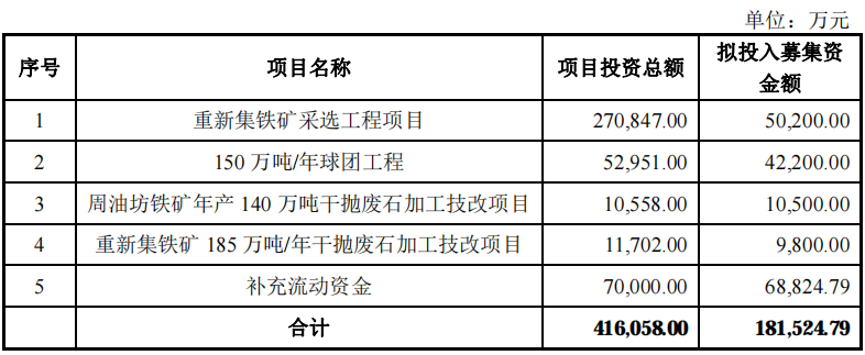 本次募集资金主要用于投资重新集铁矿采选工程项目、150 万吨/年球团工程、周油坊铁矿年产 140 万吨干抛废石加工技改项目、重新集铁矿 185 万吨/年干抛废石加工技改项目以及补充流动资金。