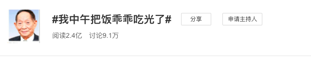 袁老去世后,一个#我中午把饭乖乖吃光了#的tag冲上热搜,从此后,不浪费,或许是我们对他最好的纪念。