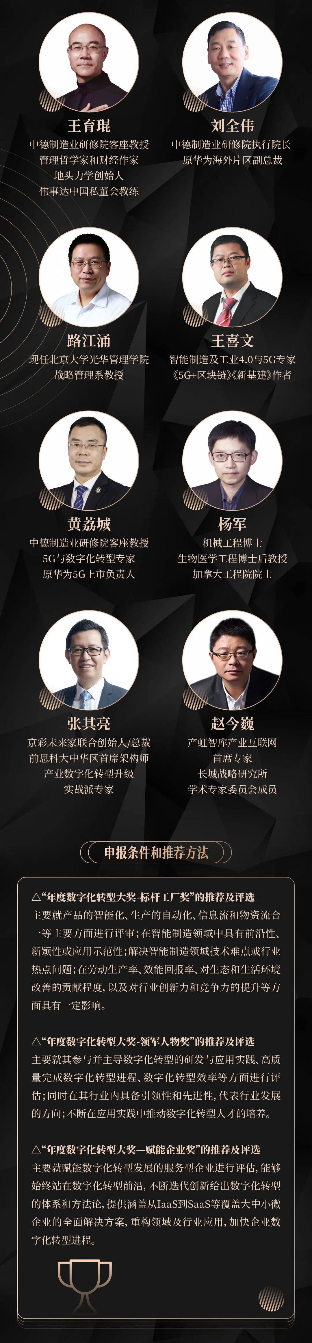 首届中国制造业领袖峰会还将发起 “年度数字化转型大奖” 评选,面向所有企业、院校、机构和个人,特别设立三大奖项: 年度数字化转型大奖之标杆工厂、赋能企业、领军人物。