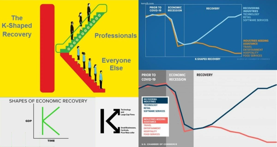K型的表现主要有四个。其一,疫情的控制和疫苗的接种率,决定了经济复苏的可能性。其二,经济体的政策工具能力,决定收割还是被收割。其三,好资产的价格泡沫化,坏资产遭强行淘汰。其四,区域发展不均衡和贫富悬殊进一步扩大。