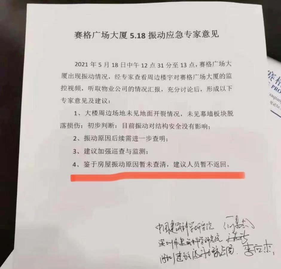 2021年5月18日12点31分,赛格广场值班人员接到租户反映感觉大楼晃动,大楼管理处迅速通过楼层广播通知楼内人员应急疏散,并安排工作人员引导人员有序撤离。