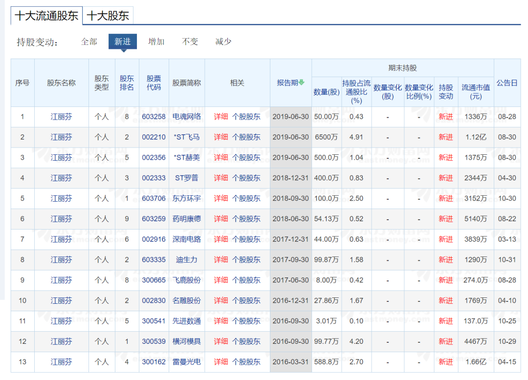 资金雄厚却难谈获利 江丽芬出生于1982年12月,住在广东省佛山市禅城区。由于其资金量不小,“江丽芬”这一名字不断出现在过往A股上市公司的十大流通股东中。东方财富数据显示, **2016年-2019年期间,江丽芬合计共登上了电魂网络、ST飞马、ST赫美、ST罗普、东方环宇、药明康德、深南电路、迪生力、飞鹿股份、名雕股份、先进数据、横河模具、雷曼光电等13只个股的十大流通股东。