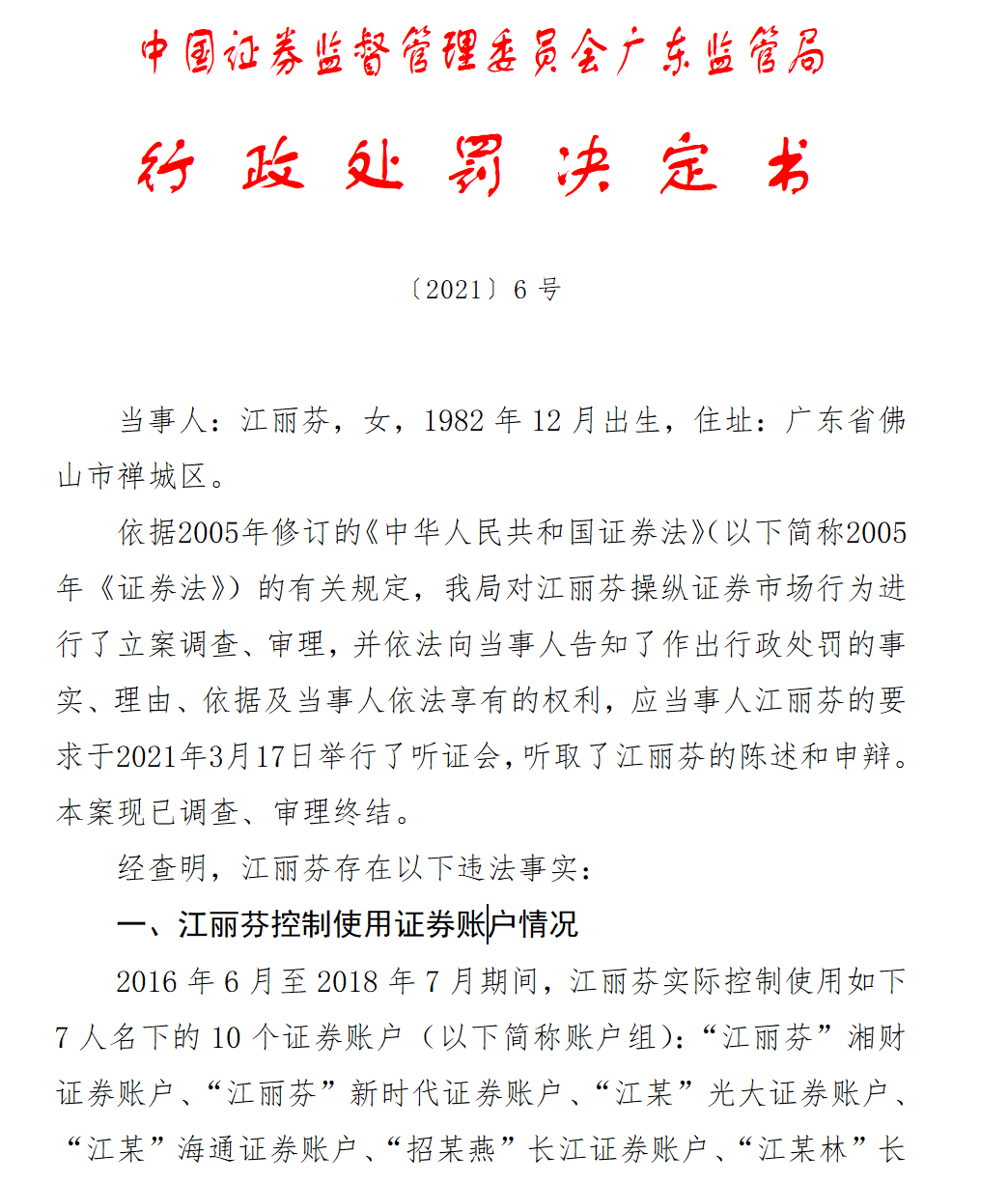 1 8笔操作手法如出一辙 获利700余万动用近13亿资金 5月13日,广东证监局披露了对江丽芬的行政处罚决定书,详细披露了江丽芬操纵“姚记扑克”“宝钢包装”、等8只股票股价的行为。行政处罚决定书显示,2016年6月至2018年7月期间,江某某控制账户组利用资金优势,大量申报买入,通过盘中多次大额封涨停、拉抬后封涨停、虚假申报等方式, 先后操纵“姚记扑克”“宝钢包装”“康跃科技”“蓉胜超微”“彩虹股份”“美尔雅”“新劲刚”“弘高创意”等8只股票股价 。其中, 操纵姚记扑克,获利77.51万元;操纵蓉胜超微”(现“贤丰控股”),获利496.04万元;操纵彩虹股份,获利107.37万元;操纵美尔雅,获利20.53万元;操纵新劲刚,获利7.74万元 。值得一提的是,江某于2016年曾通过账户组中的一个账户,通过“买入”和“卖出”“蓉胜超微”股票的方式,共计获利496.04万。 短短1天时间获利近500万 ,这也是江某在操纵8只股票中获利最多的一次。但江丽芬也不是每次都能赚钱,据行政处罚决定书显示, 江丽芬操纵宝钢包装,亏损238.90万元;操纵康跃科技,亏损17.52万元;操纵弘高创意,亏损32万元 。以宝钢包装为例,2016年8月19日尾盘,江丽芬通过账户组中“杨某英”光大证券账户,以涨停价11.15元分13笔共申报买入“宝钢包装”12362700股,占当日全市场涨停价委托数量的50.77%, 在市场涨停价申买量中排名第一 。之后,该账户又大量撤单累计400万股,占该账户申报量的32.36%。最终,该账户共成交312376股,成交金额总计34825642.40元。截至收盘该账户涨停价申报未成交股数为5239324股,占市场涨停价申报未成交股数的83.75%,在市场涨停价封单中排名第一。谁曾想,8月20日,宝钢包装开盘之后就开始暴跌,根本没有给江丽芬盈利的机会。无奈之下,2016年8月22日,江丽芬全部卖出,成交金额32480608.00元, 亏损近240万元 。据统计,江丽芬共控制使用了7人名下的10个证券账户,资金主要来源于其家庭资金。8笔交易5赚3亏,合计获利709.2万,但是在早盘集合竞价挂单涨停买入的资金, 合计高达12.97亿元 。广东证监局认为,江丽芬交易手法具有欺诈性,足以证实其有操纵市场的主观故意。当事人交易涉案8只股票封单量高、封单次数多、虚假申报比例高,强化涉案证券保持涨停的趋势,造成该股交投活跃的假象,误导了其他投资者对市场的判断和投资决策,足以证实江丽芬有操纵市场的主观故意。