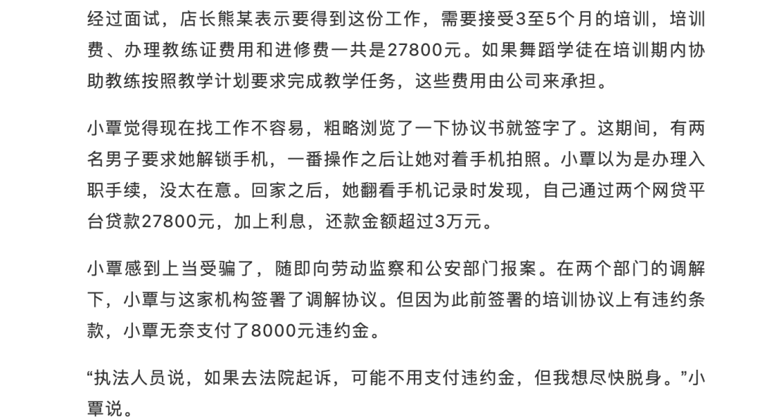 1 高薪招聘?未入职先背“贷” “月薪6000元还另有提成,一天只用工作3小时,公司还包住宿,结业之后即具备高级舞蹈教练资格。”看到广西南宁市西乡塘区某家舞蹈培训机构招聘舞蹈学徒的信息后,小覃前去求职。