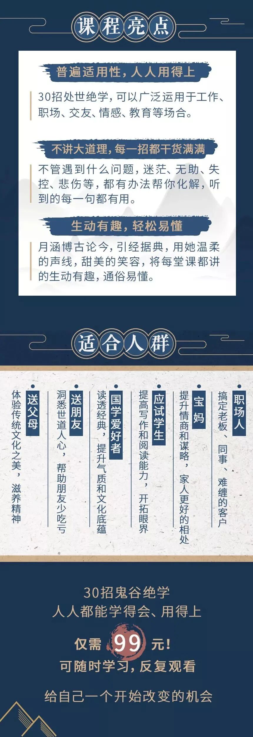 这套课程从 人际关系篇、处世情商篇、职场实战篇、思维进阶篇、自我提升篇 五大应用场景出发,可以广泛运用于工作、职场、交友、情感、教育等场合。