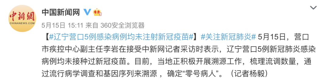 5月15日,辽宁省营口市疾控中心副主任李岩表示,营口5例新冠肺炎感染病例均未接种过新冠疫苗。