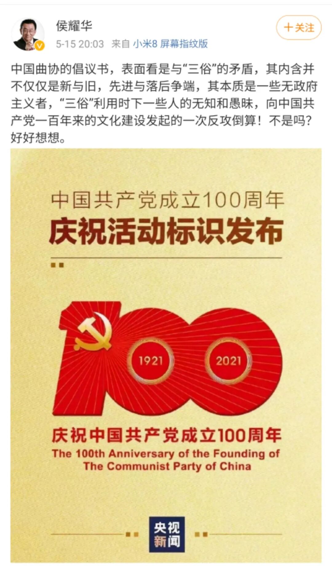 5月15日晚8点多,侯耀华在微博上写了一篇关于“反低俗”的文章。