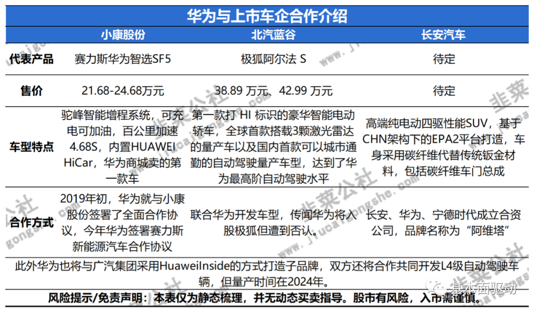 小康股份、长安汽车、北汽蓝谷是目前和华为最为紧密的汽车制造上市公司。其中小康股份和北汽蓝谷已经发布新车。