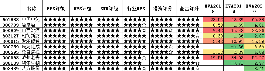 可以看到,其中有些个股的EVA是相当不错的,比如中国中免、山西汾酒、爱尔眼科、泸州老窖等,而像酒鬼酒、昭衍新药、欧普康视等,也做到了连续三年为正且逐年增加。