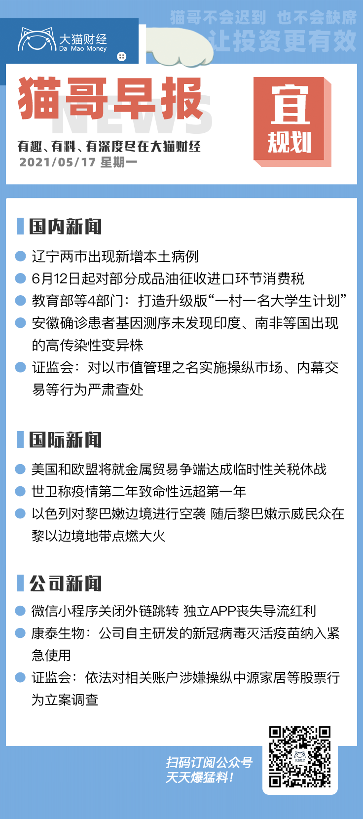 05.17财经早报| 微信小程序关闭外链跳转!证监会严查以市值管理之名操纵市场、内幕交易等行为!世卫称疫情第二年致命性远超第一年最后修改: 2021-05-16 22:04:41财经媒体大猫财经责任编辑| 邓瑞杨头图| Ritomm排版| Seagull