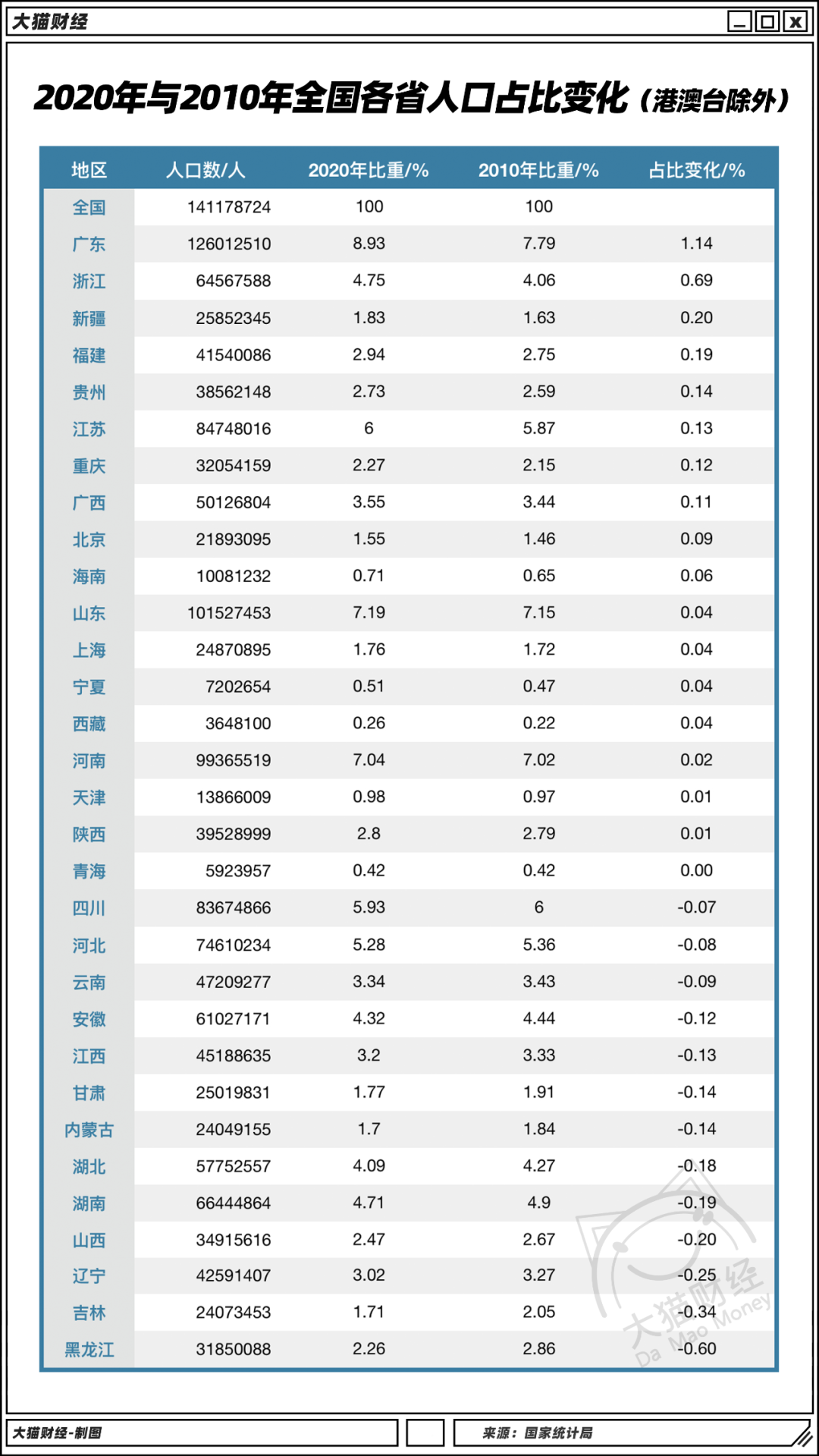 比如说广东,光是在2020这一年里人口就增加了1080万。相比之下,东北地区十年间的人口“净流出”1101万人的数字实在是有点触目惊心。