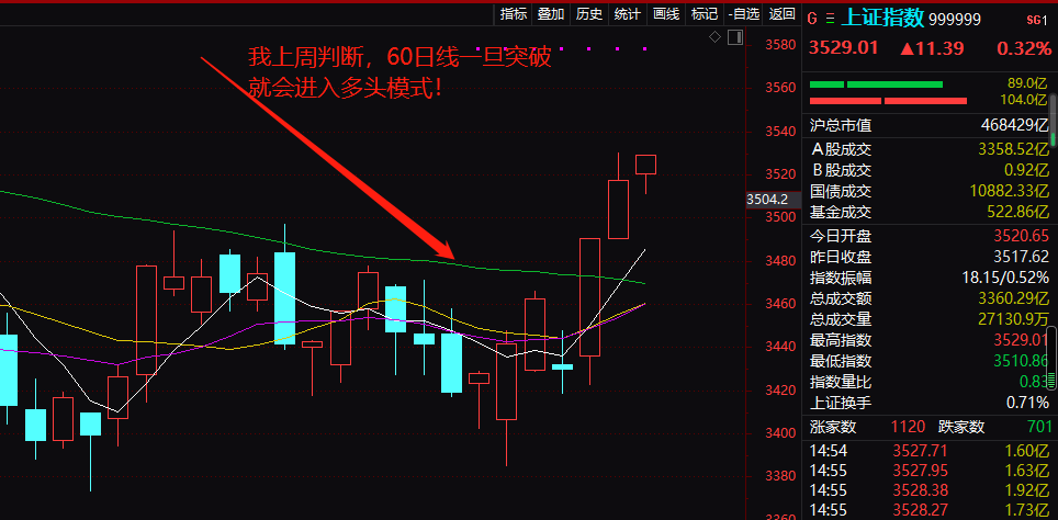 走势符合预期,这是从3700多点高位调整以来,第一次收盘价站上60日线,这期间调整时间从2月18见顶,到今天整好3个月,沪指终于再次突破中期压力线(60日线),我上周的判断是60日线为突破信号,目前看,很准确;