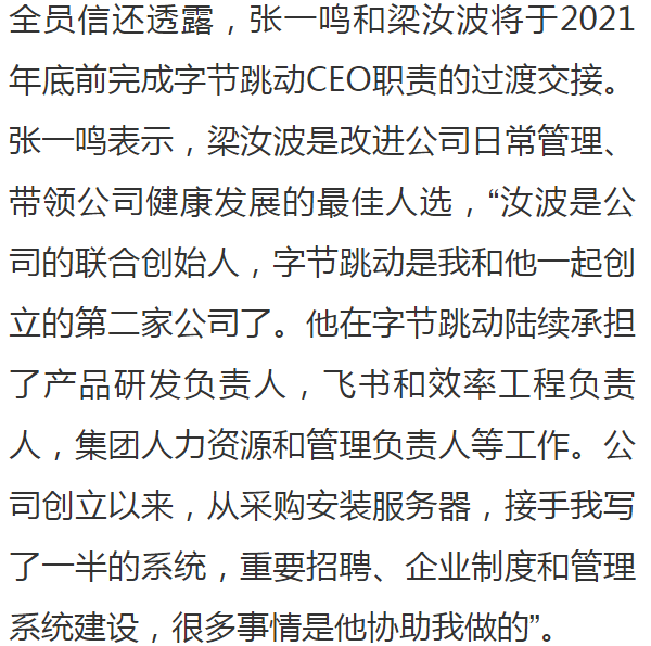 5月20日,字节跳动创始人张一鸣发布内部全员信,宣布卸任CEO一职。字节跳动联合创始人梁汝波将接任成为新CEO。